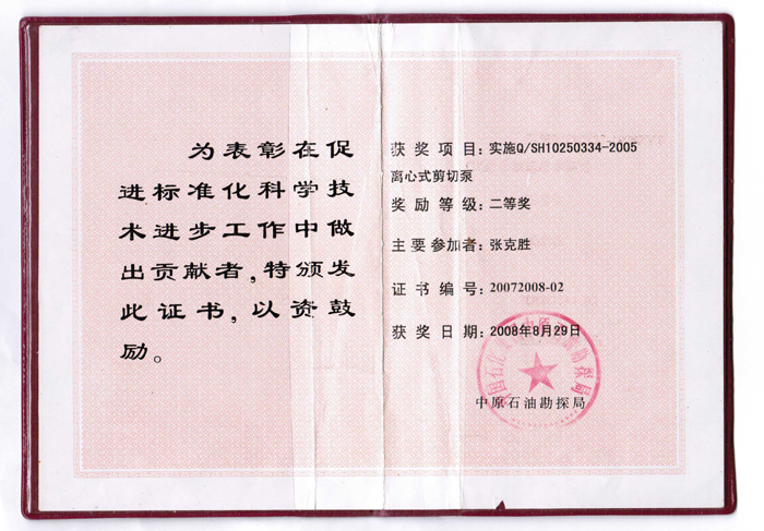 • 剪切泵獲獎(jiǎng)證書(shū)